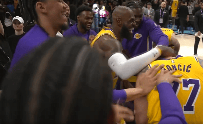 东契奇往前场走去罚球的时候,镜头给到了詹姆斯还有替补席的湖人球员,一个个都很高兴东契奇将迎来一个精彩的60分之夜。而东契奇罚球的时候,热火主场都响起了MVP呼喊声。 只能说这样的77,还有什么不满意的?