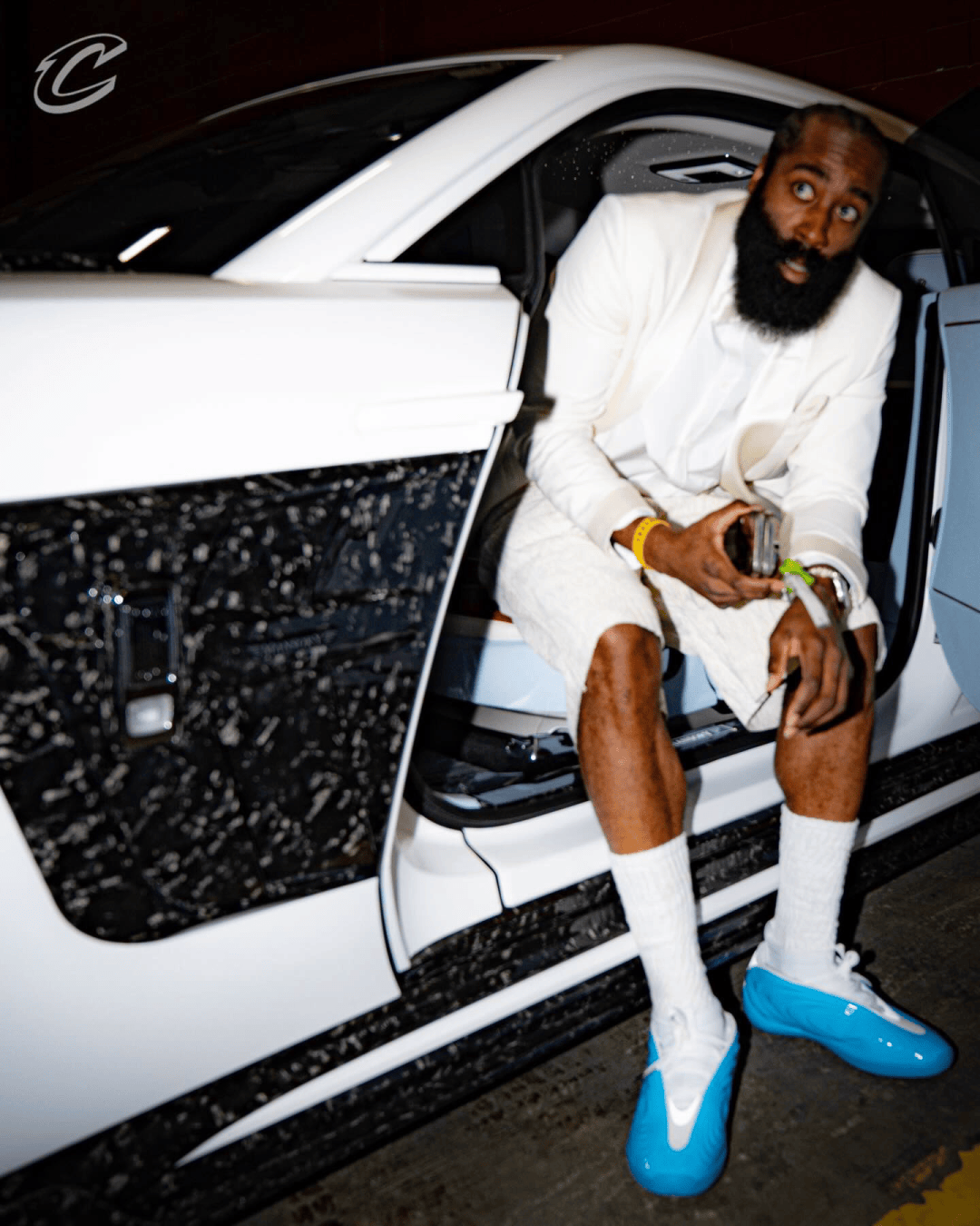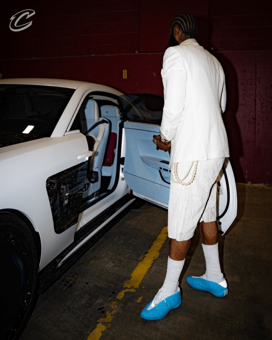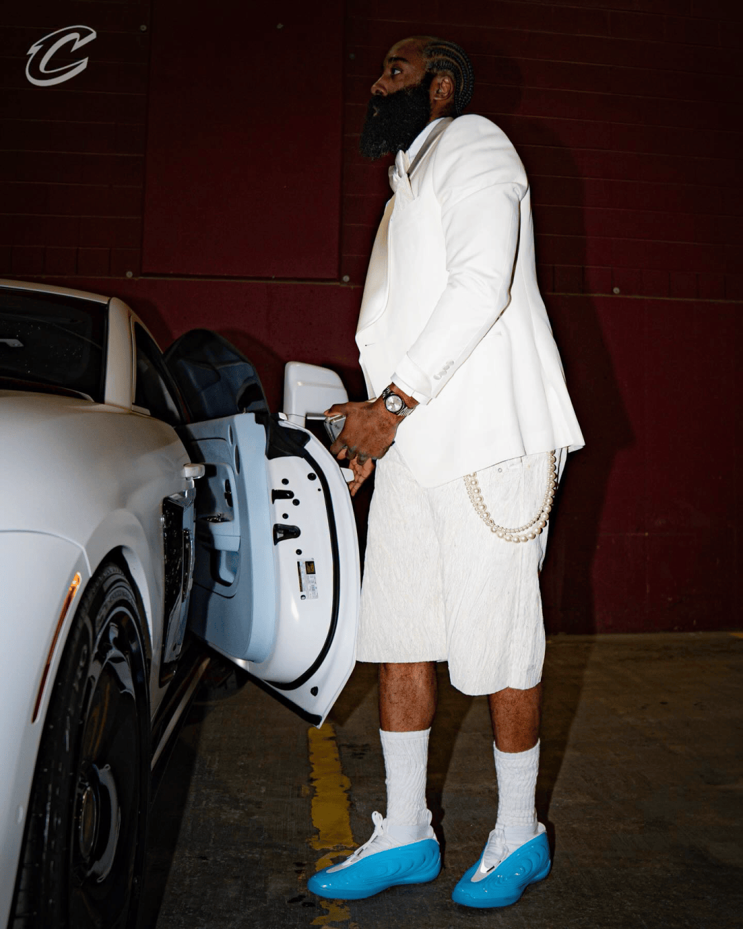 哈登今日份入场造型!为搭配新配色球鞋,劳斯莱斯也改了同款配色涂装!