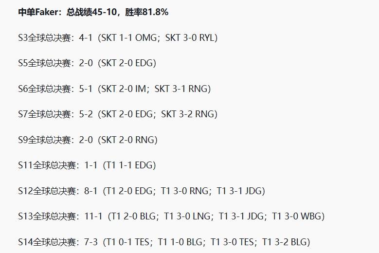 最后要重点说的就是Faker选手,在队内其他选手来之前,Faker就是冠军了,而且对阵LPL赛区的胜率一直都非常高,到目前为止Faker选手已经和LPL赛区交手55场,赢下了其中的45场,一个极其恐怖的数据。