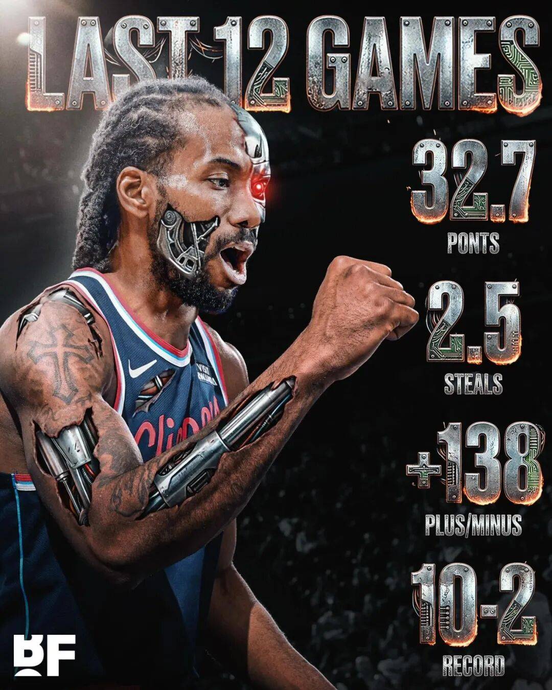 而快船也靠着近期13战11胜的表现,摆脱了西部末尾的排名。在这13场比赛中,莱昂纳德场均32.7分6.9篮板3.8助攻2.6抢断1盖帽,堪称攻防一体。在这期间,他还有过单场41+8+5、55+11+5、45+7的超巨输出。而这在以稳著称的小卡生涯也是不多见的,他职业生涯合起来就8次40+。
