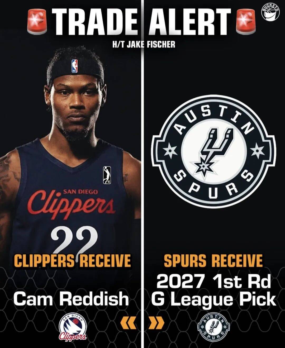奥斯汀马刺很快认领了雷迪什,随后将他交易到了圣迭戈快船,换来了圣迭戈快船2027年G联盟首轮选秀权。