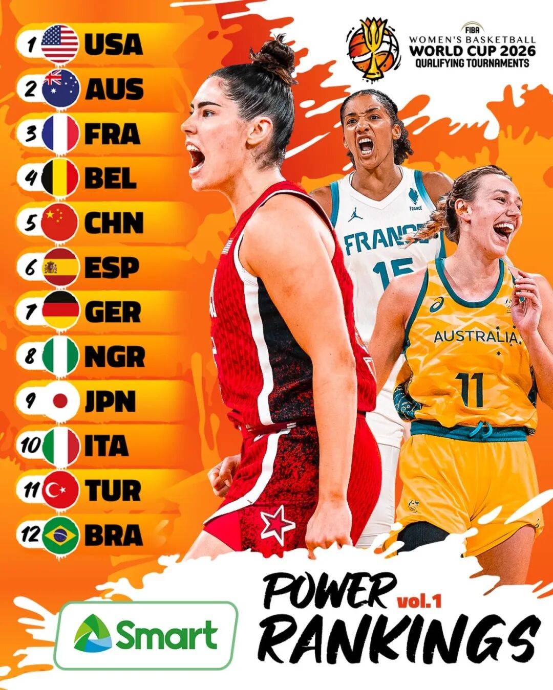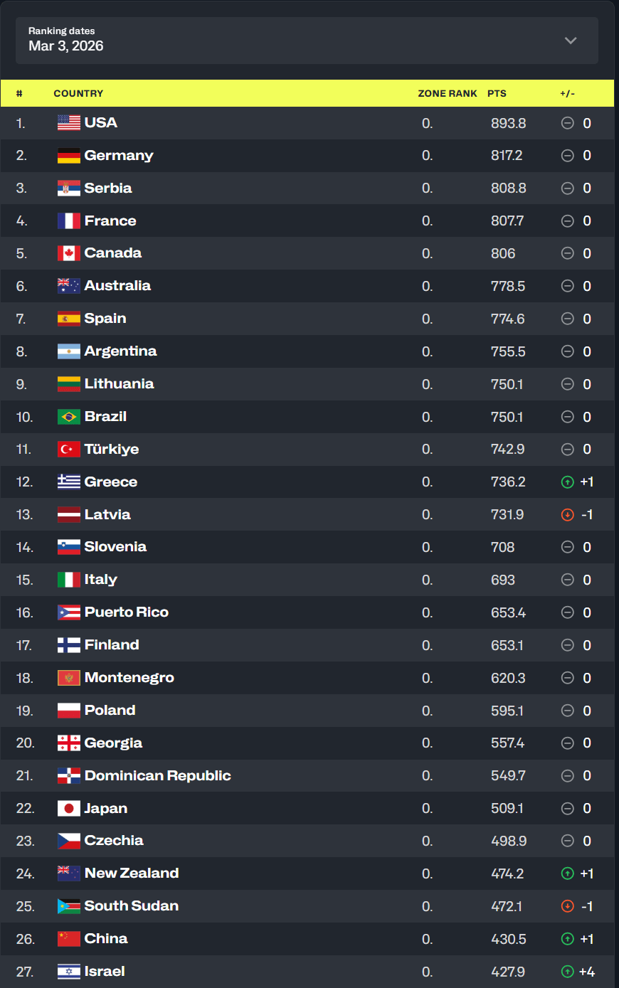 FIBA更新了男篮最新世界排名!美国、德国、塞尔维亚、法国、加拿大分列前五。
