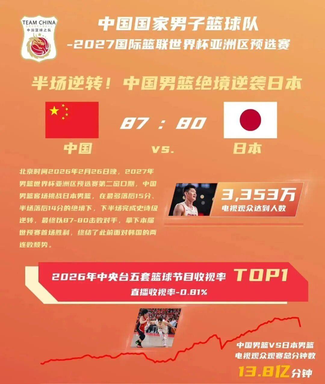 中国男篮依旧是全国人民关注的焦点,在此次第二窗口期比赛关注度也是相当之高。面对日本首战,比赛的直播收视率0.81%,位列2026年中央台五套篮球节目收视率第一位;比赛电视观众达到人数3353万人,观赛总分钟数13.8亿分钟。