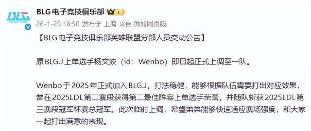 之前Bin背书包出走事件时,BLG曾发布人员变动公告,二队上单选手(id:Wenbo)即日起正式上调至一队,并且说明了是“临时上调”。