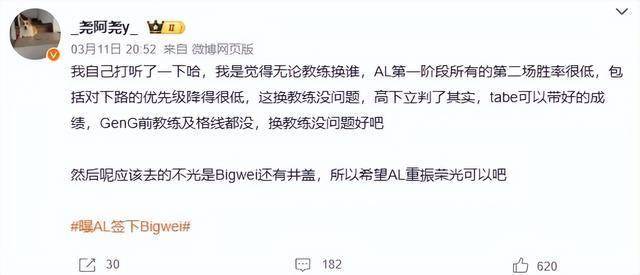 同时博主爆料,AL的教练组将会新增BigWei和井盖,加上原有的马老师,组成赛训组。BigWei就是24年世界赛决赛,BLG自ban蝎子的教练。井盖就是24年MSI,带领TES以0:3输给G2的教练。AL两位新教练,堪称卧龙与凤雏,爱笑真是病急乱投医了。