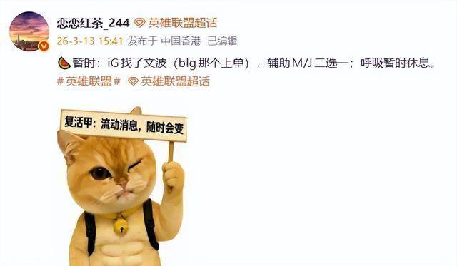 电竞博主“恋恋红茶”透露,iG已确定签约BLG二队上单选手文波(杨文波),辅助位将在“M/J”两名选手中二选一,呼吸哥(Breathe)则暂时处于休息状态。