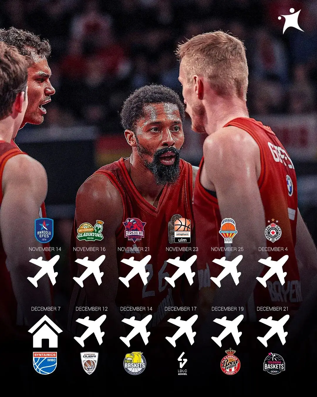 拜仁篮球队即将进入一段长达40天的魔鬼赛程,在12场比赛中有11场要在客场进行。