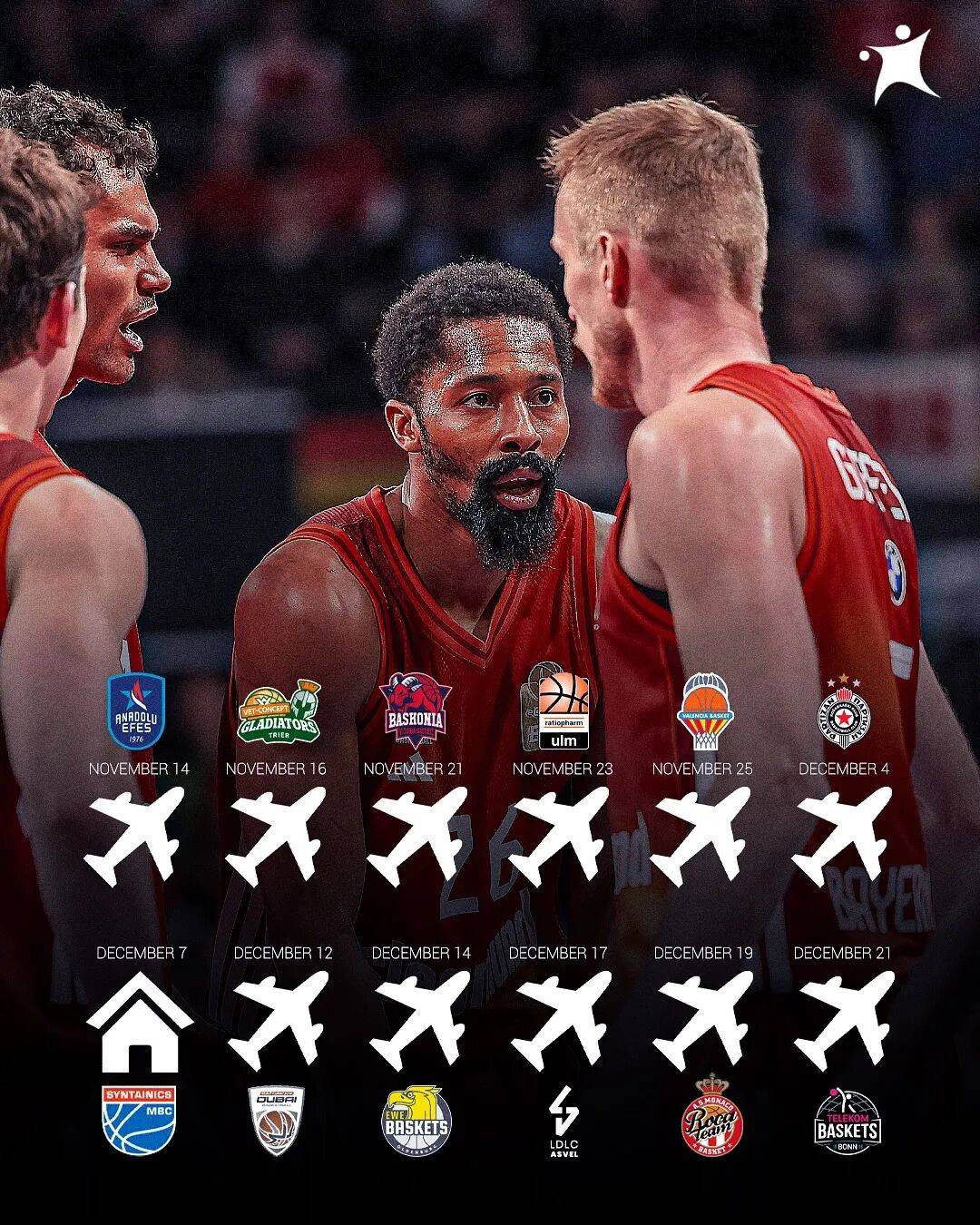 从11月14日到12月4日,连续6个客场;12月7日短暂回主场对阵魏森费尔斯MBC;随后再从12月12日到12月21日,连续5个客场,其中包括前往迪拜(迪拜队加入了欧篮联)的长途旅行。