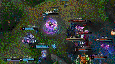 CFO的先锋进攻回合,Junjia先锋骗出巨魔柱子后直接开团巨魔配合女枪大招扫死巨魔,后牛头也阵亡,CFO一波拆掉两座防御塔,AL直接陷入巨大落后之中。