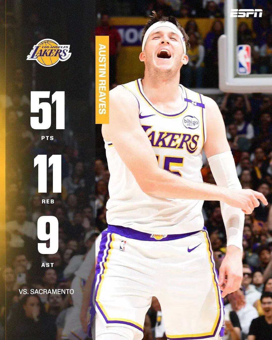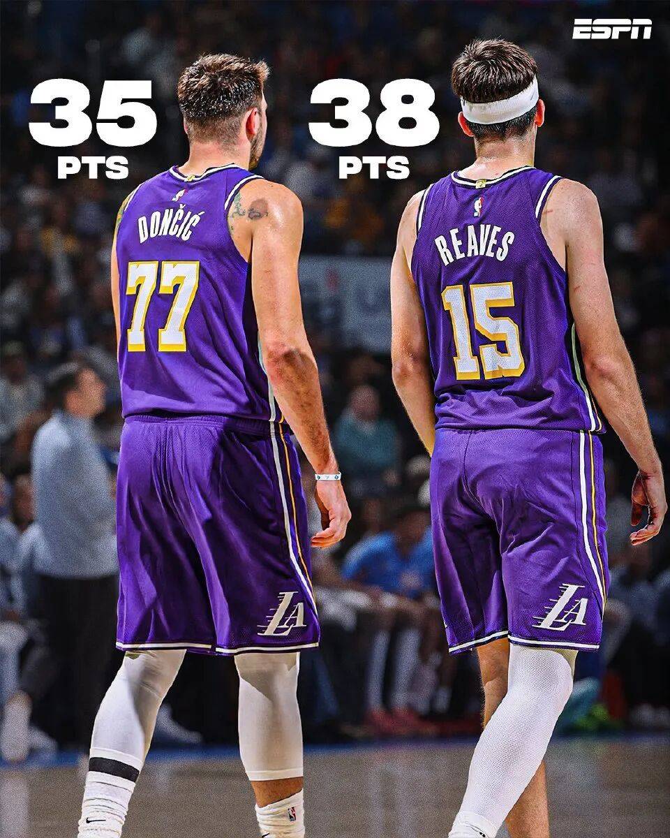 值得一提的是,今天也是东契奇、里夫斯两人连场第二场合砍70+分,上一场比赛东契奇砍下43分、里夫斯拿到31分。而今天两人是都35+,成为了湖人21世纪以来,第四对同场砍下35+的队友。