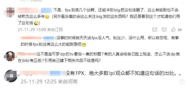 这也引起了BLG粉丝与FPX粉丝之间的骂战。FPX粉丝认为:“没有FPX,绝大多数lpl观众都不知道这句话的出处。”而BLG粉丝认为:“这是宝可梦dp的tv最后一集的标题,跟FPX没关系。”“有什么好删的都是抄宝可梦。”