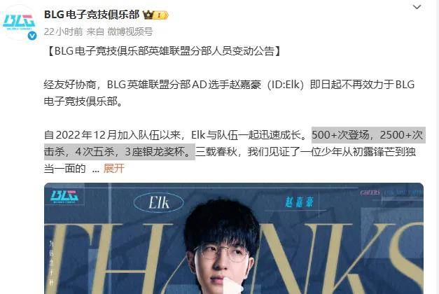 11月29日,BLG正式官宣曾经的战队队长ELK离队,BLG官方给ELK的评价还是挺高的。“500+次登场,2500+次击杀,4次五杀,3座银龙奖杯。”