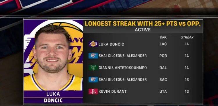 湖人今天“客场”打快船。比赛还没开始,转播镜头就给出画面。东契奇他可太爱打快船了!他面对快船的比赛已经连续14场得分25+了,这是联盟并列现存最长的纪录。