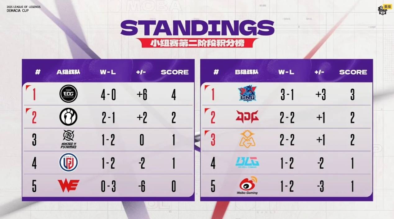 本次德杯的规则是两个小组排名前三的队伍晋级,B组方面的五支队伍,在赛前大家认为的三支强队时JDG,BLG和WBG,OMG和LNG两支队伍看起来实力是偏差的,但实际打起来之后根本不是那么回事。