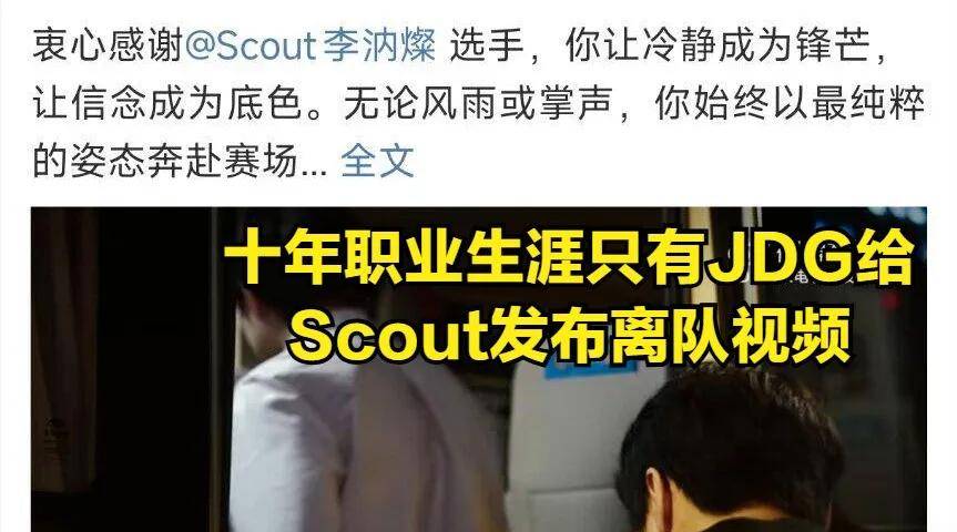 除背刺EDG外,Scout还梅开二度,抛弃LNG私下加盟JDG,害的小天差点失业,LNG经理在直播期间都大骂Scout,认为其“背信弃义”。不过,Scout离开后,JDG战队为其拍摄了离队视频,Scout在直播期间公开感谢JDG,表示JDG老板人很好,自己在JDG过得很舒服。JDG也成为Scout在LPL的10年职业生涯当中,仅有的为其拍摄离队祝福的战队。