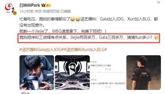 LPL第1轮竞拍,Gala被JDG拍得,Jiejie直接被WBG拍走。圈内人透露Jiejie只有200多万,Gala也只有300多万。巅峰时期的Jiejie薪资一度达到了七八百万,Gala今年所在的IG年薪也有五六百万。